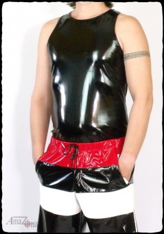 4-way (elastic in all directions) stretch sporty vinyl muscle shirt.