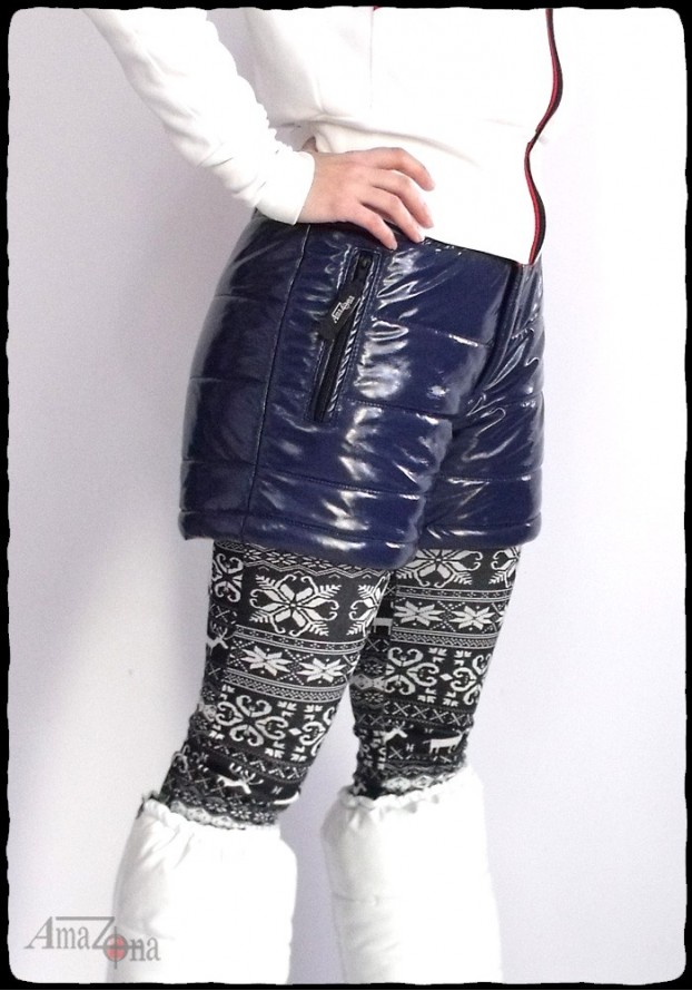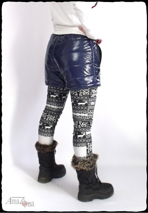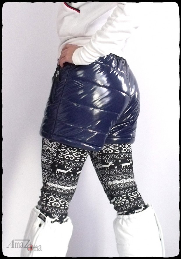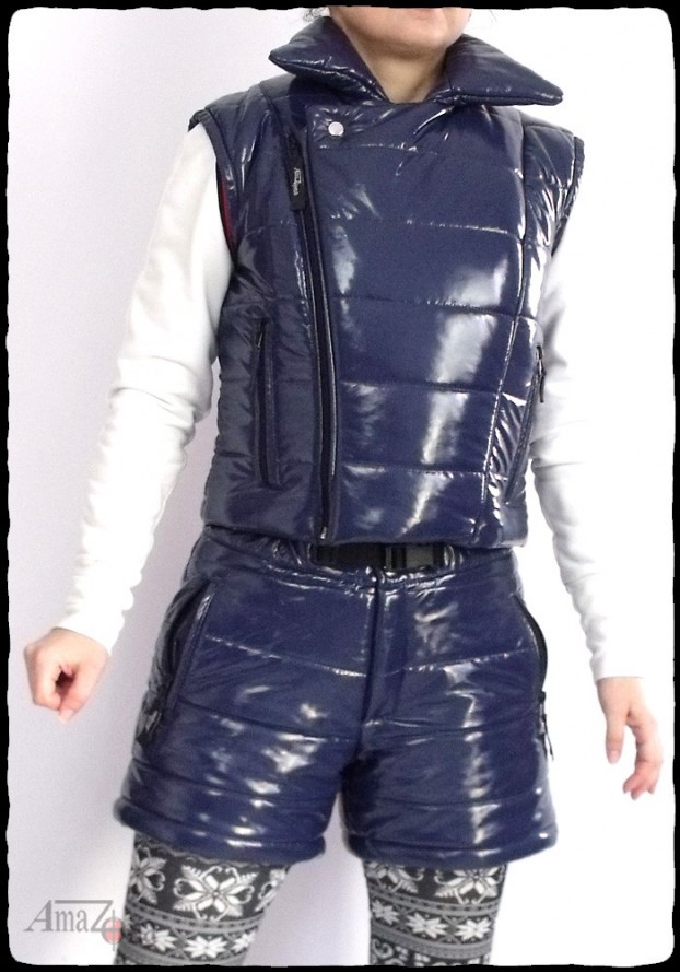Warm and lightweight shiny vinyl puffy short pants for women with silk lining. Thick quilting, 2 front pocket. Tightened at the waist with an elastic belt and plastic buckle.