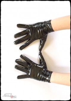 Black shiny vinyl puffy jacket for men with zip detachable hood with drawstring, extra thick quilting, satin or same colour vinyl lining inside, full lenght front zipper, high, filled collar, two zipper side pockets and patch pocket with...