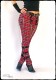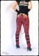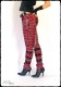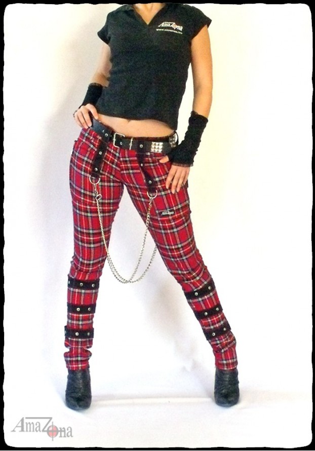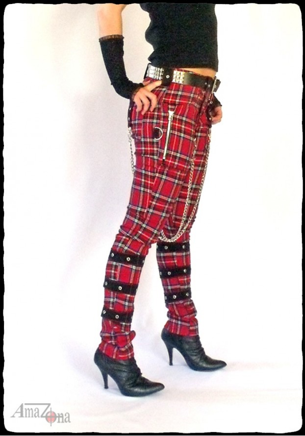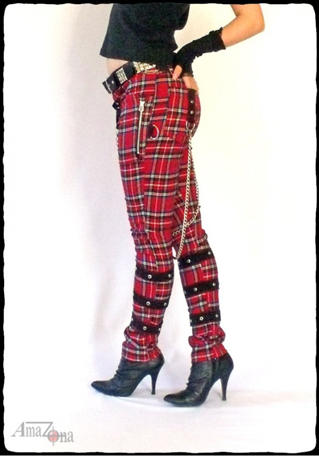 Straight cut, slightly elastic, tartan bondage pants with detachable chains, zips, straps and D-rings. Zip fly, two front and two rear pockets. With three rivets decorated straps.