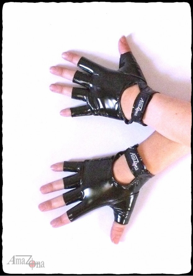 4–way stretch vinyl fingerless mini party gloves, with Amazona logo on the wrist.