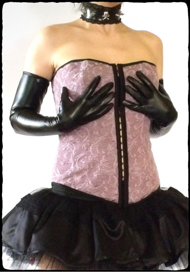 Long, stretch leatherette opera lenght gloves reaching almost the top of the upper arm.