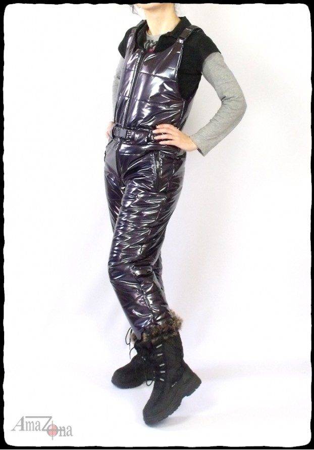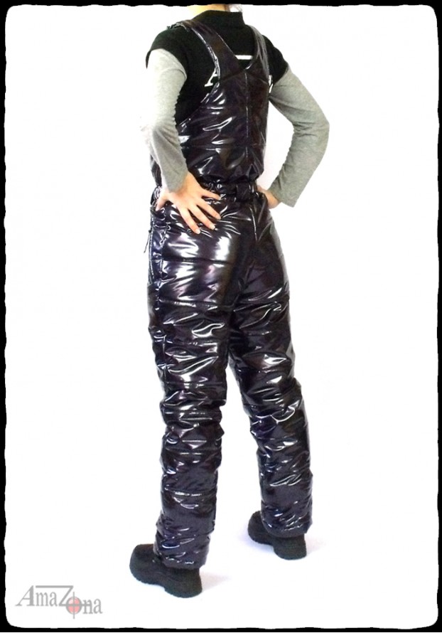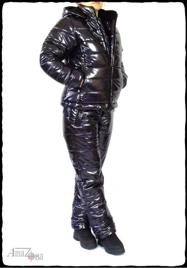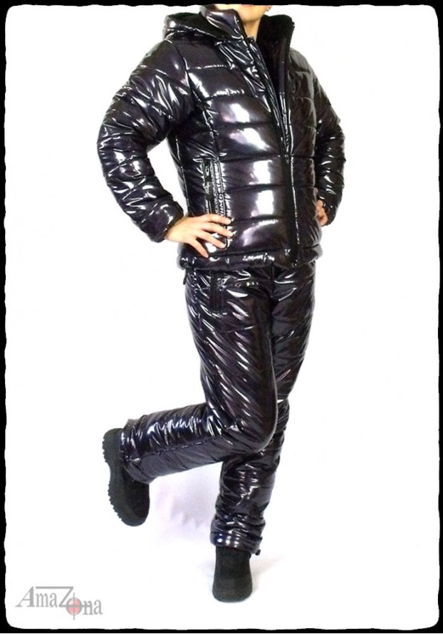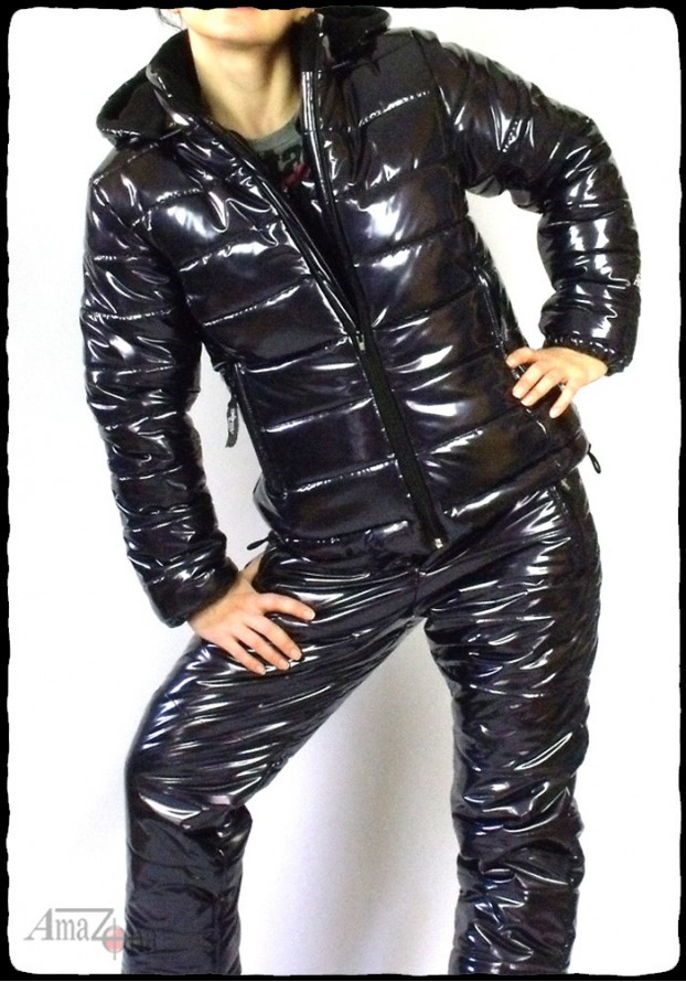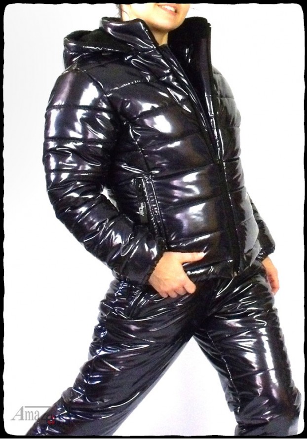 Shiny vinyl puffy suit for women. The suit consists of a jacket and a trousers.