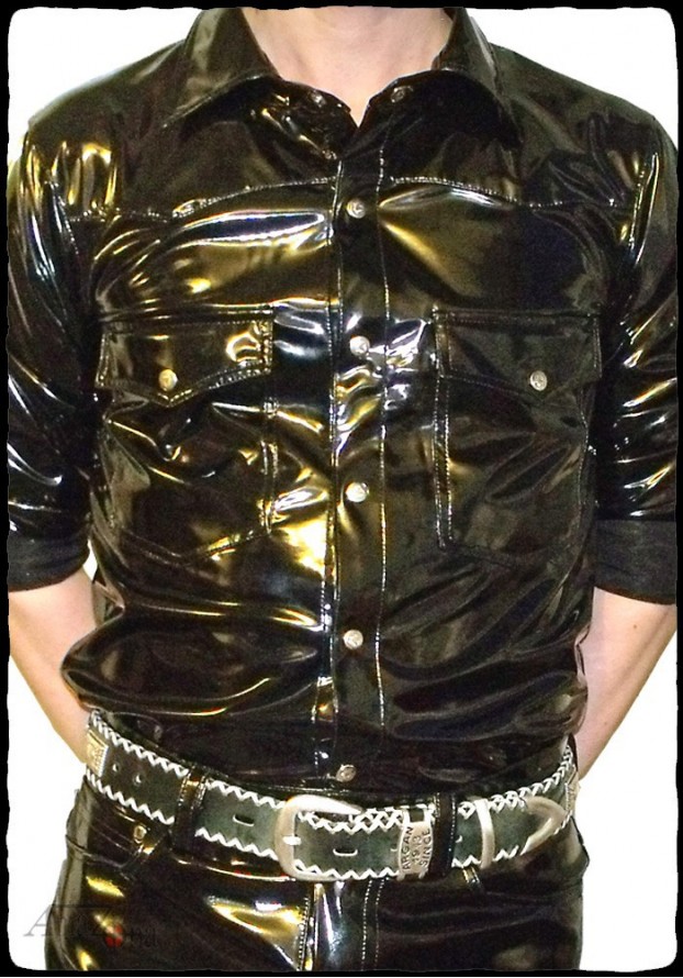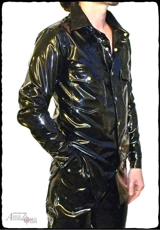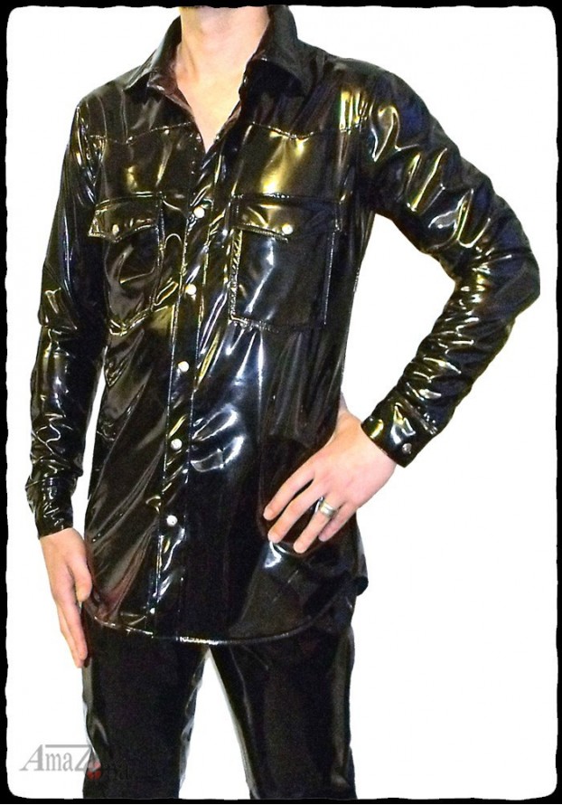 4-way stretch (elastic in all directions) vinyl men's shirt with original cut and rounded bottoms. Long, cuffed sleeves and two front stitched pockets.