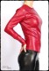 Long-sleeved faux leather shirt with rounded bottom, with zipper at the back and at the end of the sleeves.