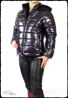 Shiny vinyl puffy vest for women with extra thick quilting, satin or vinyl lining inside, full lenght front zipper, high, filled collar, two zipper front pockets, inner security pocket with Velcro. Optional zip detachable hood with satin...