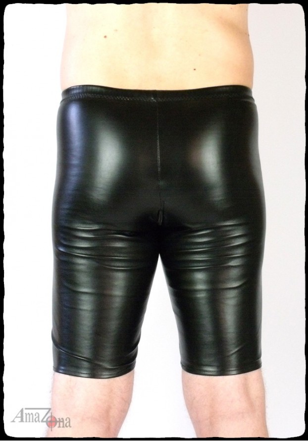 Stretch faux leather tight cycle shorts for men with elastic waistband. Top quality thin stretch leather material. Optional with crotch zip.