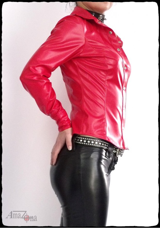 Karcsúsított fazonú, kiváló minőségű, puha műbőr anyagból készült női ing. Zseb nélkül, eleje és mandzsettája patenttal záródik.