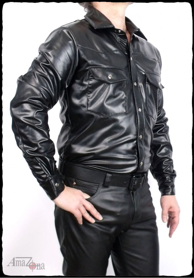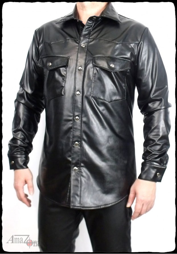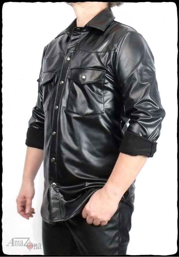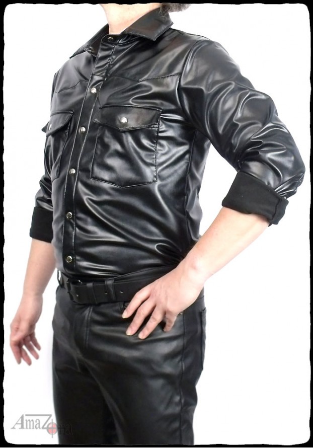 Farmering fazonú, férfi ing vajpuha sztreccs műbőr anyagból, hosszú, mandzsettás ujjal, elől két zsebbel. Zsebein és a mandzsettáin patentokkal, lekerekített aljjal.