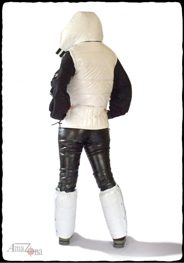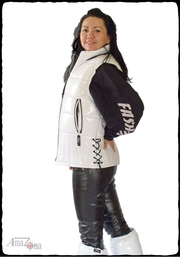 Fényes lakk női pufi mellény vastag, habkönnyű töltelékkel, elől két cipzáros zsebbel. Steppelt selyem béléssel készül, de választhatod lakk béléssel is. Vállánál gumírozott szűkítő, elöl végig cipzár, álló, puha gallér. Deréktájon függőleges steppeléssel és fűzőkkel. Választható hozzá selyem- vagy lakk béléses cipzárral levehető kapucni. Elején két cipzáros zseb, bal oldalon, belül tépőzáras belsőzseb.