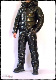 Lakk pufi dzsekiből és nadrágból álló szett, levehető kapucnival, vastag, habkönnyű töltelékkel. Steppelt selyem béléssel készül, de rendelhető lakk belsővel is.